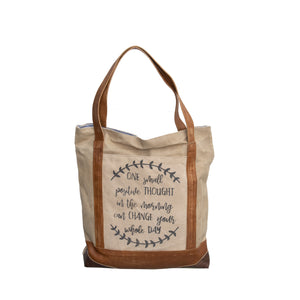 Upcycled Canvas Tote with Leather Handles 'One Positive Thought' Quote
